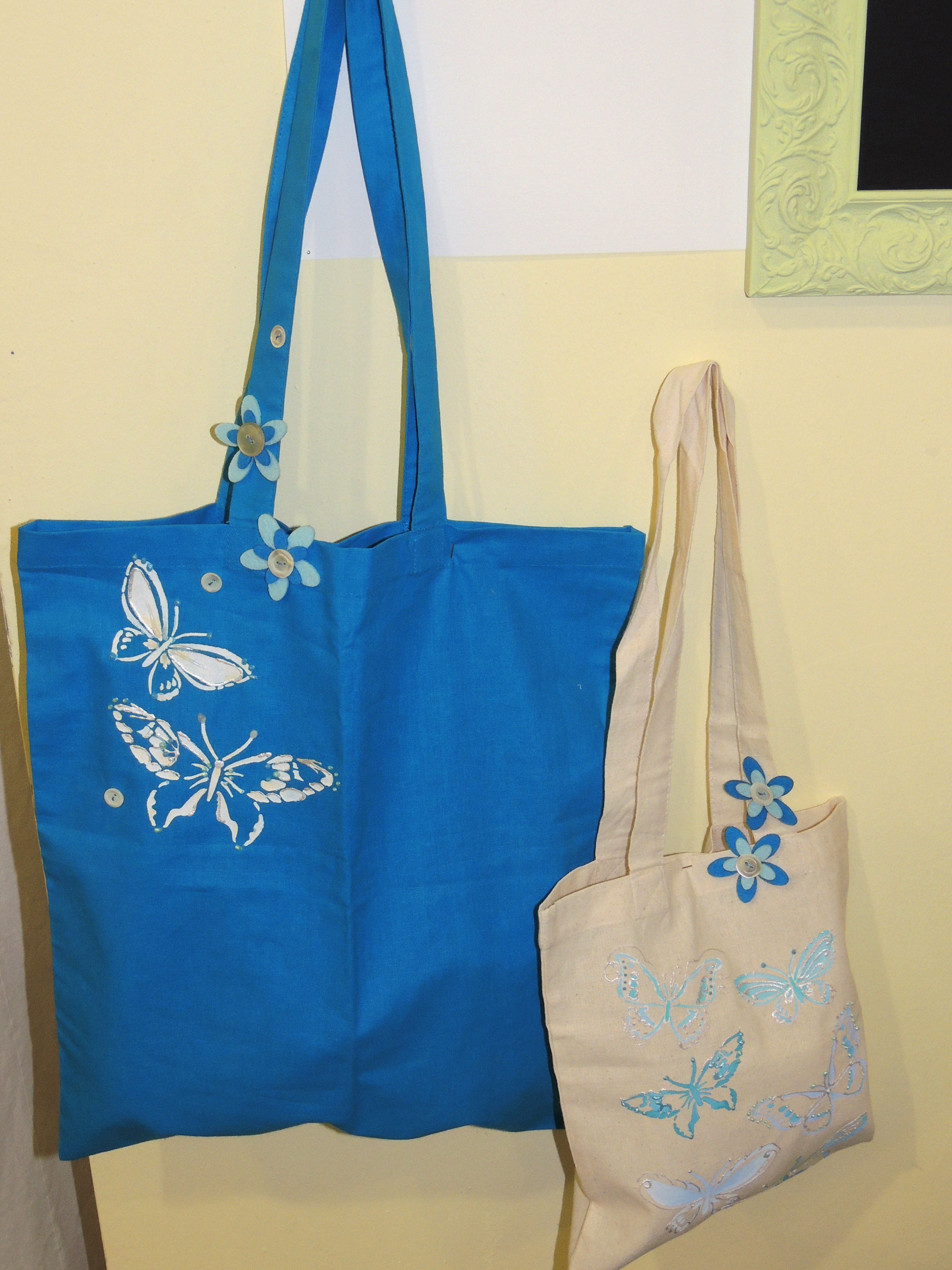 A meglevő akrilfestékhez keverjünk 1:1 arányban Hobbyművész textilmédiumot, és máris készíthetjük a strandszatyrokat magunknak és gyermekünknek is. Az itt látható színes és natúr pamutszatyrokhoz pillangós stencilt használtunk.