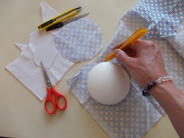 Első lépésként rajzoljuk körbe a patchwork anyagon a styropr medált, majd 7-8 mm ráhagyással vágjuk ki a köröket.