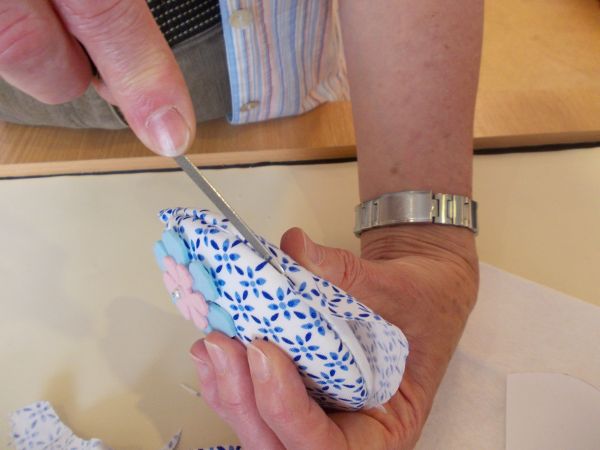 A kivágott anyagokat helyezzük rá a medál oldalára, majd a körömreszelővel tuszkoljuk be az anyag szélét a vágott mélyedésbe, ezt csináljuk meg mind a két oldalon.