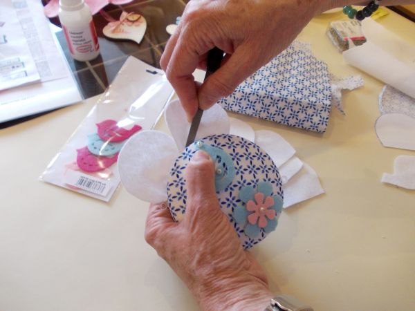 Majd szépen sorban, kicsi átfedéssel tömködjük be az oldalsó hézagba, ahova az anyagokat tömködtük, a filcből kivágott virágszirmokat. Ha hiányzik, vágjunk ki még egyet.