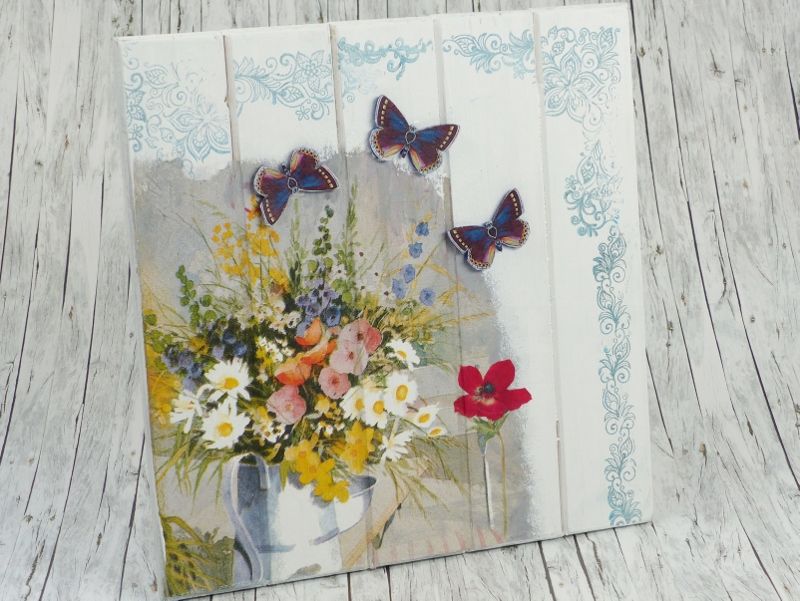 A deszka alapot az alapozóval átkentük, száradás után a szalvétával decoupage-oltuk, és pecsételéssel díszítettük. Néhány pillangót dekorgumira decoupage-oltunk, majd száradás után kivágtuk és ráragasztottuk a képre.