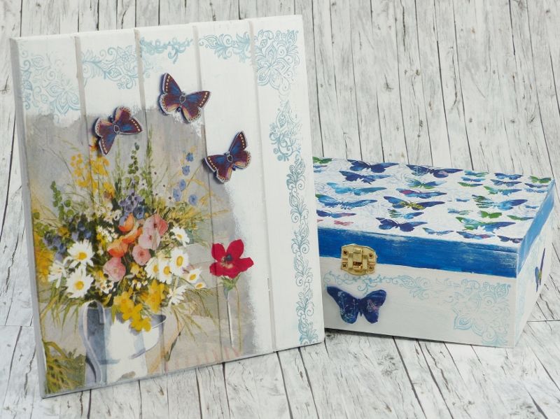 Első, kék összeállításunkban egy fadobozt és egy faliképet készítettünk.