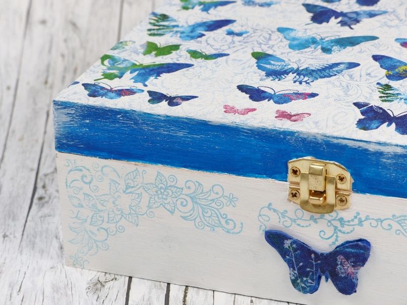 A fadobozt hasonlóan díszítettük, csak szalvéta helyett a pillangókat vágtuk ki a papírból és decoupage ragasztóval rögzítettük.