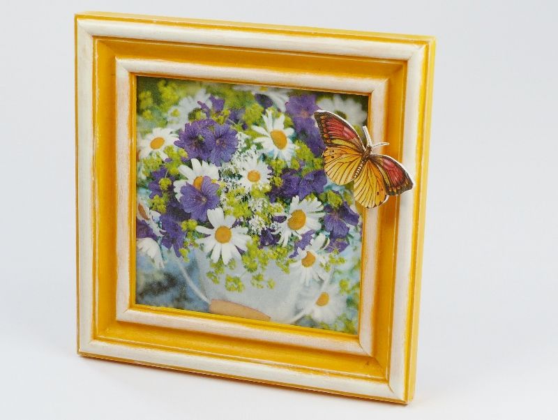 A doboz élét és a képkeretet sárga Hobbyművész festékkel díszítettük és fehérrel antikoltuk. Az antikolást vagy száraz ecsettel, vagy szivaccsal csináljuk, kevés festéket tegyünk rájuk, tupfoljuk le a felesleget egy papíron, majd laza mozdulatokkal kenjük át az antikolni kívánt felületeket.