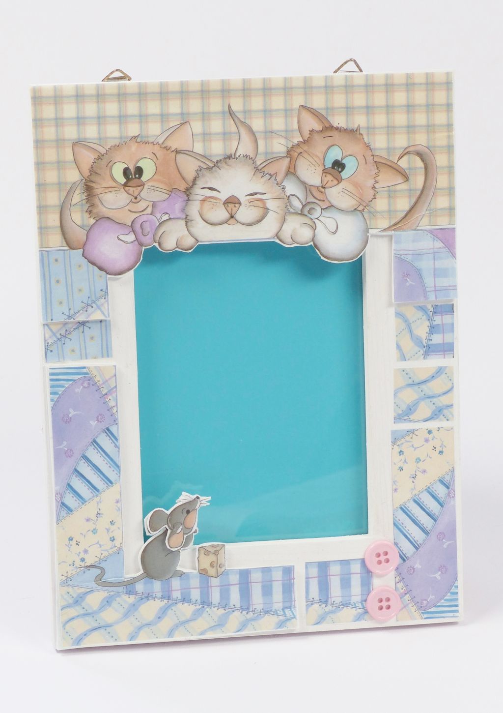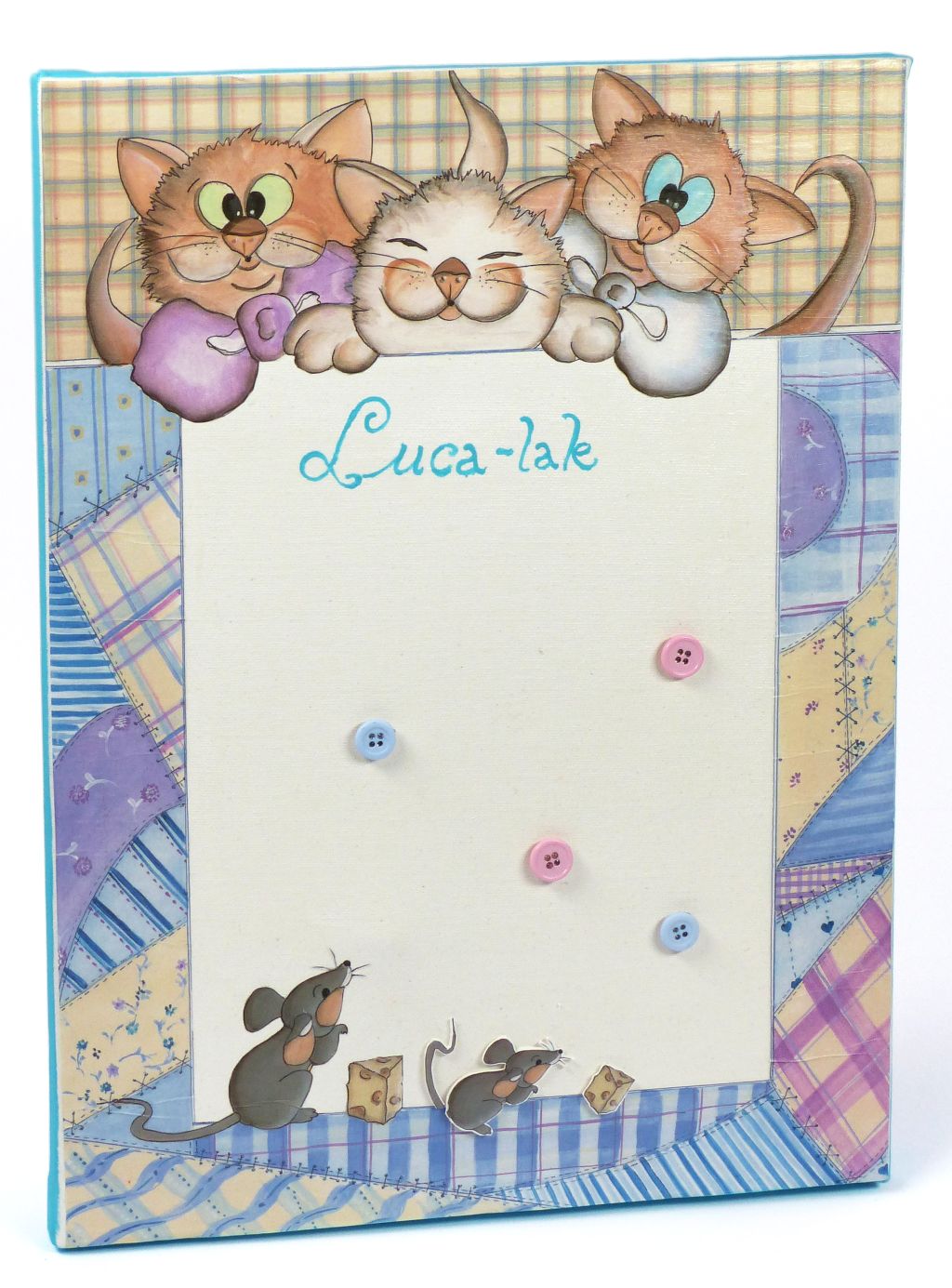 Hozzávalók: cicás és macis decoupage papír, decoupage ragasztó, táblafesték, mágnes, képkeret, feszített vászon, kerámia cserép, gombok és fehér dekorgumi, ha térbeli decoupage-t szeretnénk készíteni.