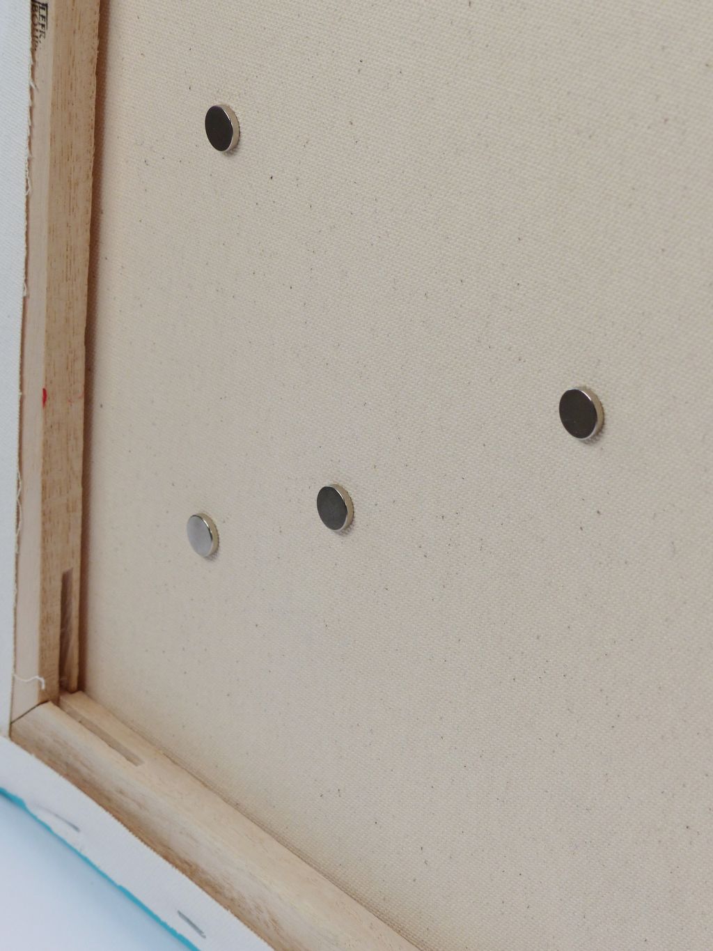 A legnagyobb mintát fehér feszített vászonra ragasztottuk. Ebből mágneses táblát is készíthetünk. Vagy a hátoldalát jó vastagon átfestjük mágnesfestékkel, vagy egy-egy mágnest teszünk a gombok alá és a hátoldalra is és így tologathatjuk a gombokat.