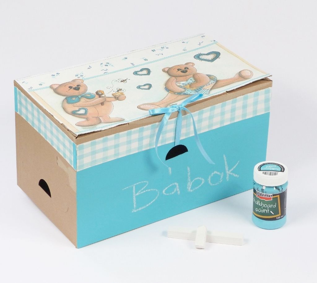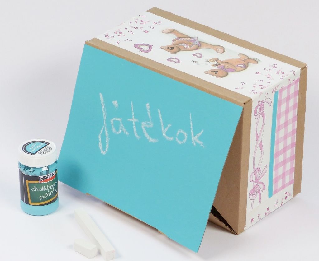 Minden háztartásban előforduló dobozokból készültek a játéktartók. A doboz egyik oldalát színes táblafestékkel fessük le és így bármikor igény szerint változtahatjuk a doboz tartalmát.