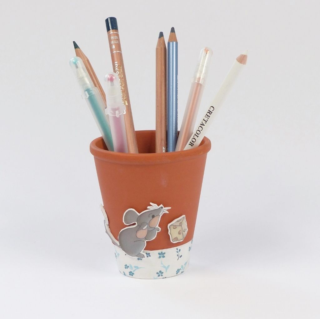 Egy használaton kívüli virágcserépből készült a ceruzatartó. Az alsó csík közvetlenül a cserépre lett ragasztva, rajta az egeret és a sajtot először fehér dekorgumira decoupage-oltuk, majd száradás után kivágtuk és a cserépre ragasztottuk. A térbeli egér olyan, mintha bármikor elindulhatna 🙂