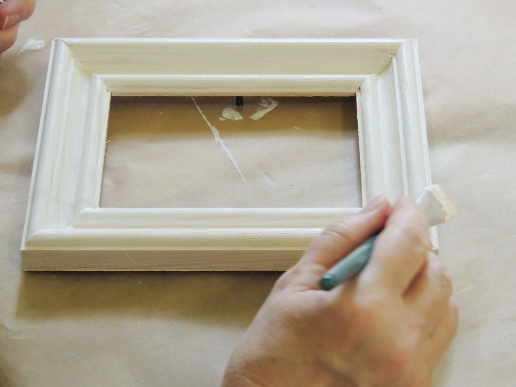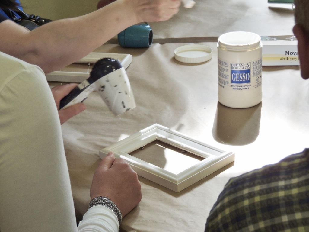 A natúr fa képkeretet lapozzuk le ecsettel gesso-val, vagy használjuk a Pinty Gesso spray-t.