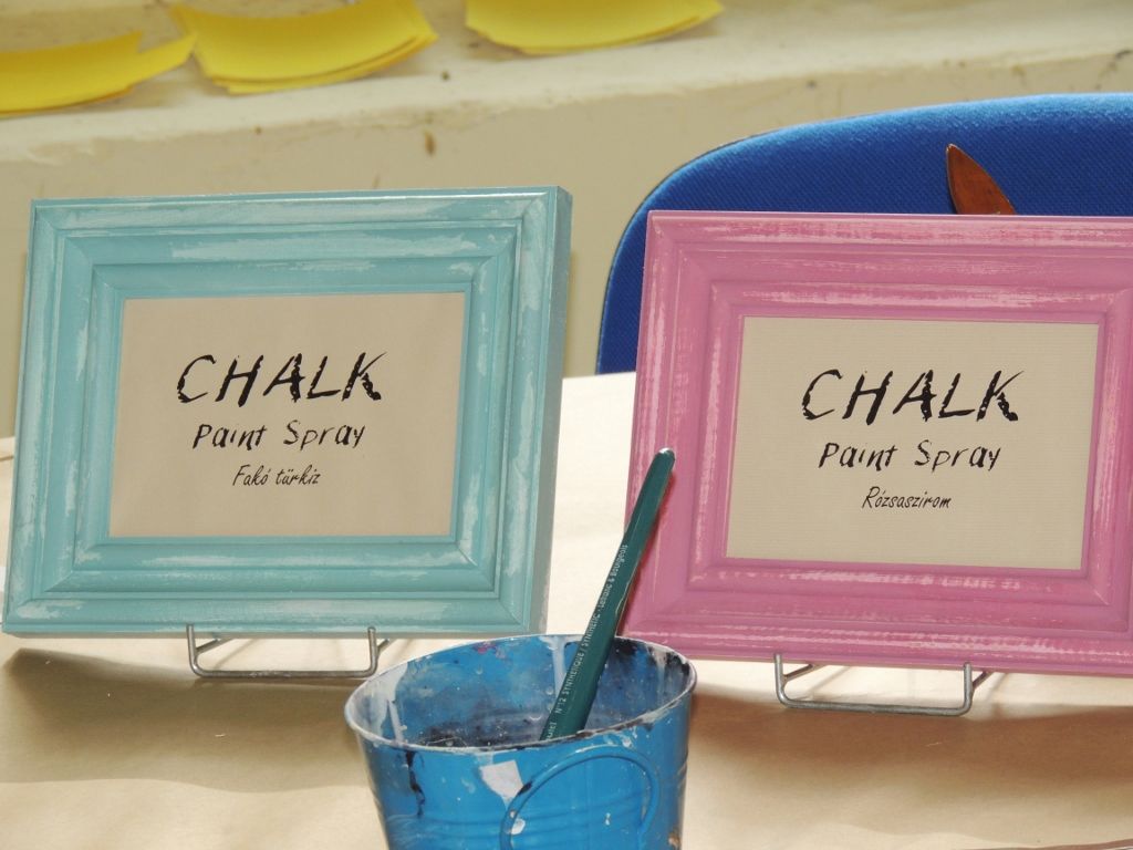 A fenti képen a képkeretet és az üvegeket a krétafesték spray-vel festettük le.