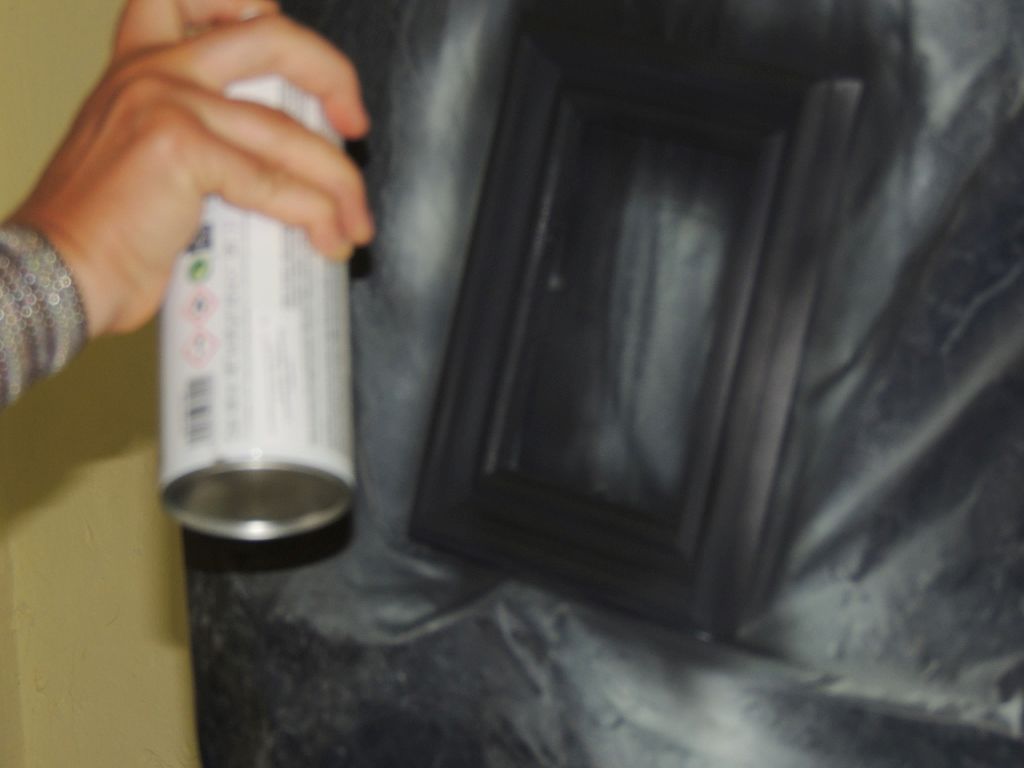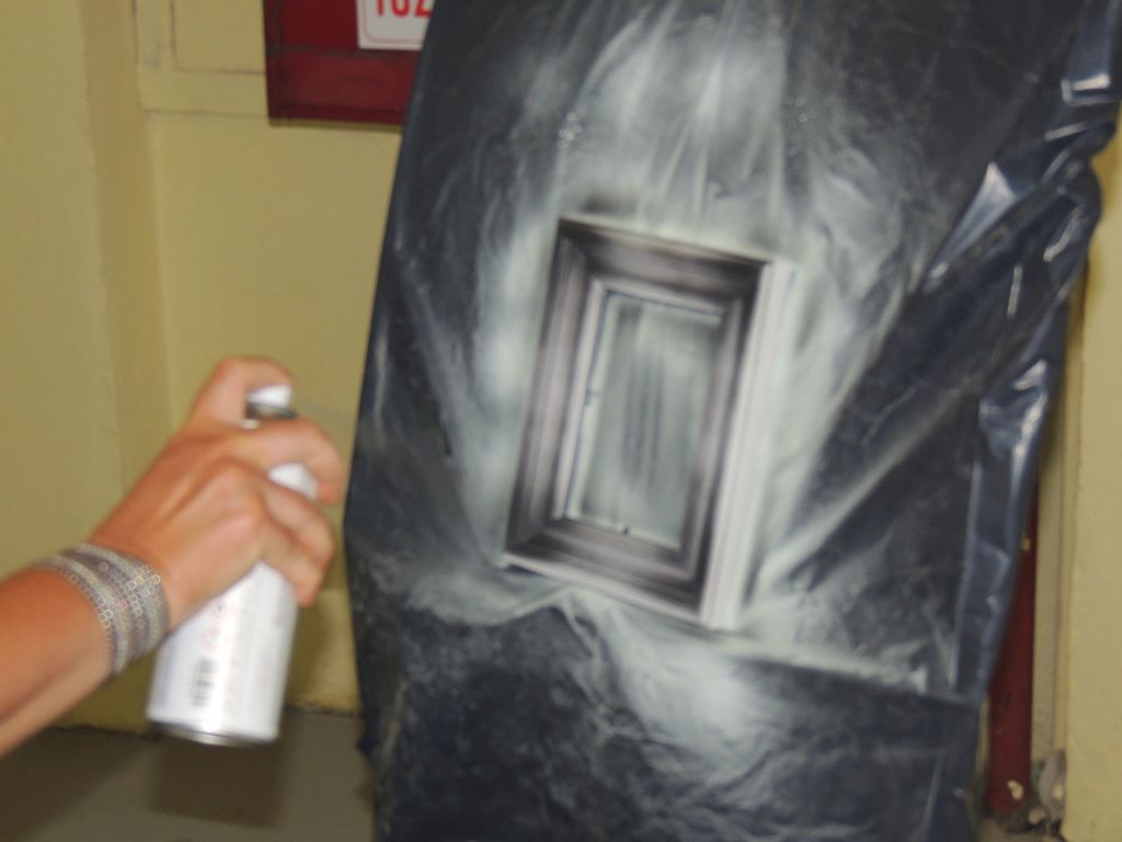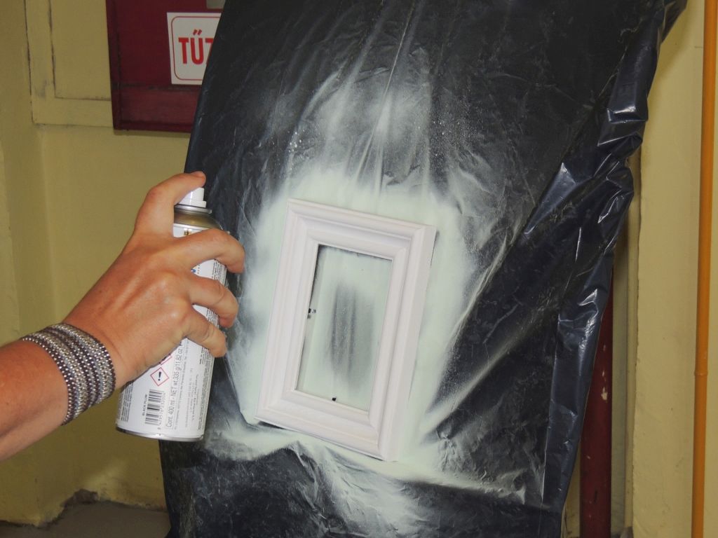 Száradás után helyezzük a keretet egy fóliára, hogy a spray a környező területet ne szennyezze be.
