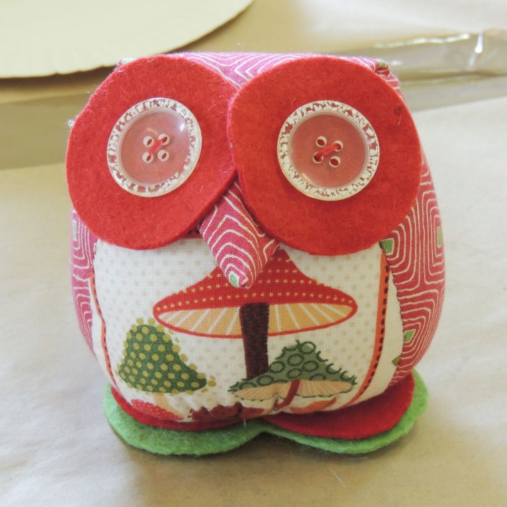 - A szemeket varrjuk fel. Ehhez a tűvel átölthetünk a bagoly hátoldalához, húzzuk át a tűt, majd önmagába visszaöltve szúrjunk vissza a gomblyukba, az öltés nem látszik, de a belső töltőanyag megfogja a cérnát. Így öltögessünk 3-4-szer a gombok rögzítéséhez.