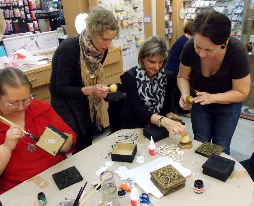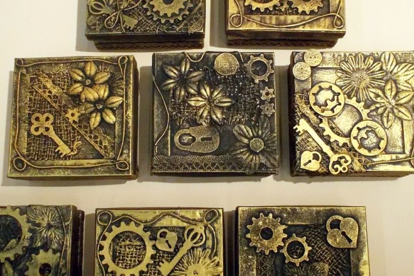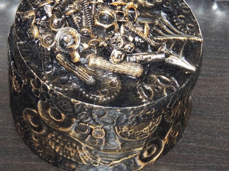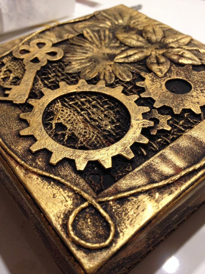 A fenti képen papírmasé dobozokat díszítettünk steampunk stílusban. Ha tetszik, kövesd végig az alábbi lépésről-lépésre képes leírást.