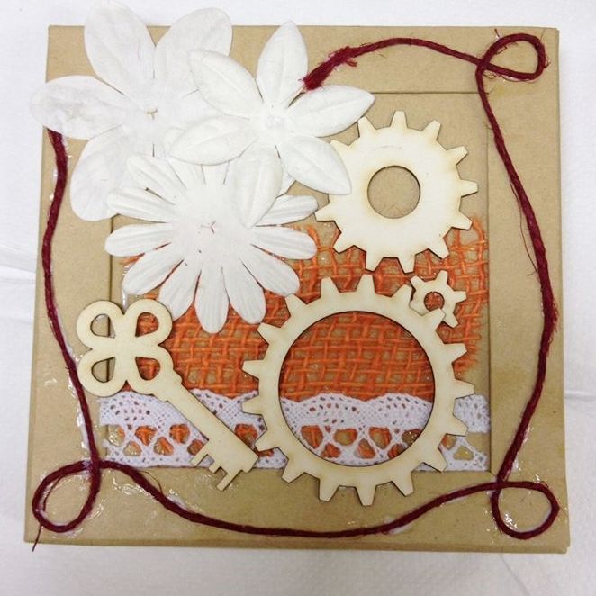 Először a papírmasé doboz tetejére ragasszuk fel a már előre kiválogatott hozzávalókat. Mi juta szalagot, csipke szalagot, kenderzsineget, készen kapható papír fogaskerekeket és kulcsot, papír virágokat válogattunk össze. Ezek az elemek a steampunk stílus legmeghatározóbb díszítő elemei. A témába illő otthoni maradékokat is bátran használjuk, mint csavarok, óra alkatrészek, régi kulcsok (mennyi van belőlük!), régi csipketerítő vagy függöny darabok.