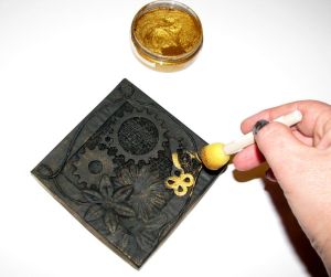 Ezután szivacsecsettel és az Inka Gold metál festékpasztával, vagy a Pentart metál viaszpasztával kenjük át a felületet, fémes csillogást, antik hatást adva a munkánknak.
