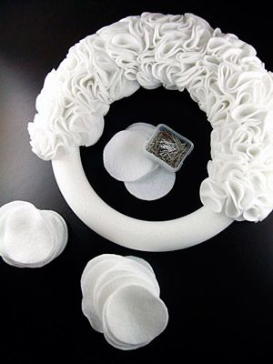 A másik képen a hungarocell koszorúalapot kör alakú barkácsfilc vagy patchwork anyag darabokkal szúrkodjuk telibe. Útmutató a képek alatti forrásnál.